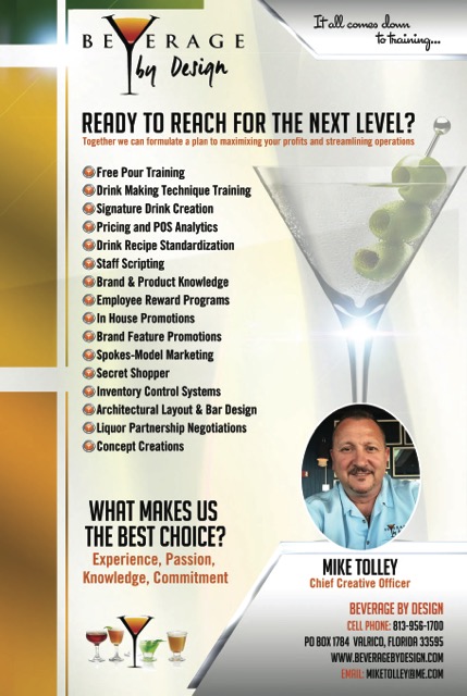 "Mike Tolley is one of the most creative and hands on trainers and beverage consultants in the marketplace. He has led many seminars for my events over the years and his ability to convey useful and applicable information regarding training, technique and taste is unsurpassed. With years of experience both behind the bar and creating custom beverage programs is an asset to any organization. He's definitely one of my go-to industry professionals time and time again." Jen Robinson CEO The Pineapple Group llc jen@thepineapplegroup.net -